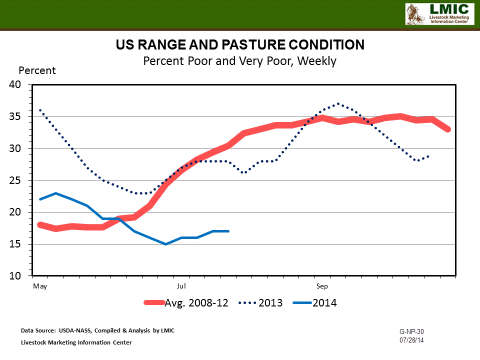 The summer pasture and grazing season is half over. USDA-NASS weekly crop progress reports pasture and range conditions for approximately 26 weeks starting in May and ending late October. The latest data reported July 27th is 13 weeks from the first report. The largest contrast between this year and last year has been the year-over-year improvement in U.S. range and pasture condition. The five year average, which now includes Southern Plains drought in 2012 and the Midwest drought in 2013, shows pasture conditions deteriorated quickly from the first of July through October. Rolling back to pre-2011, the five year average displays a similar pattern but is less severe. Regardless, past and present historical patterns indicate this year is a bit of a pleasant anomaly.