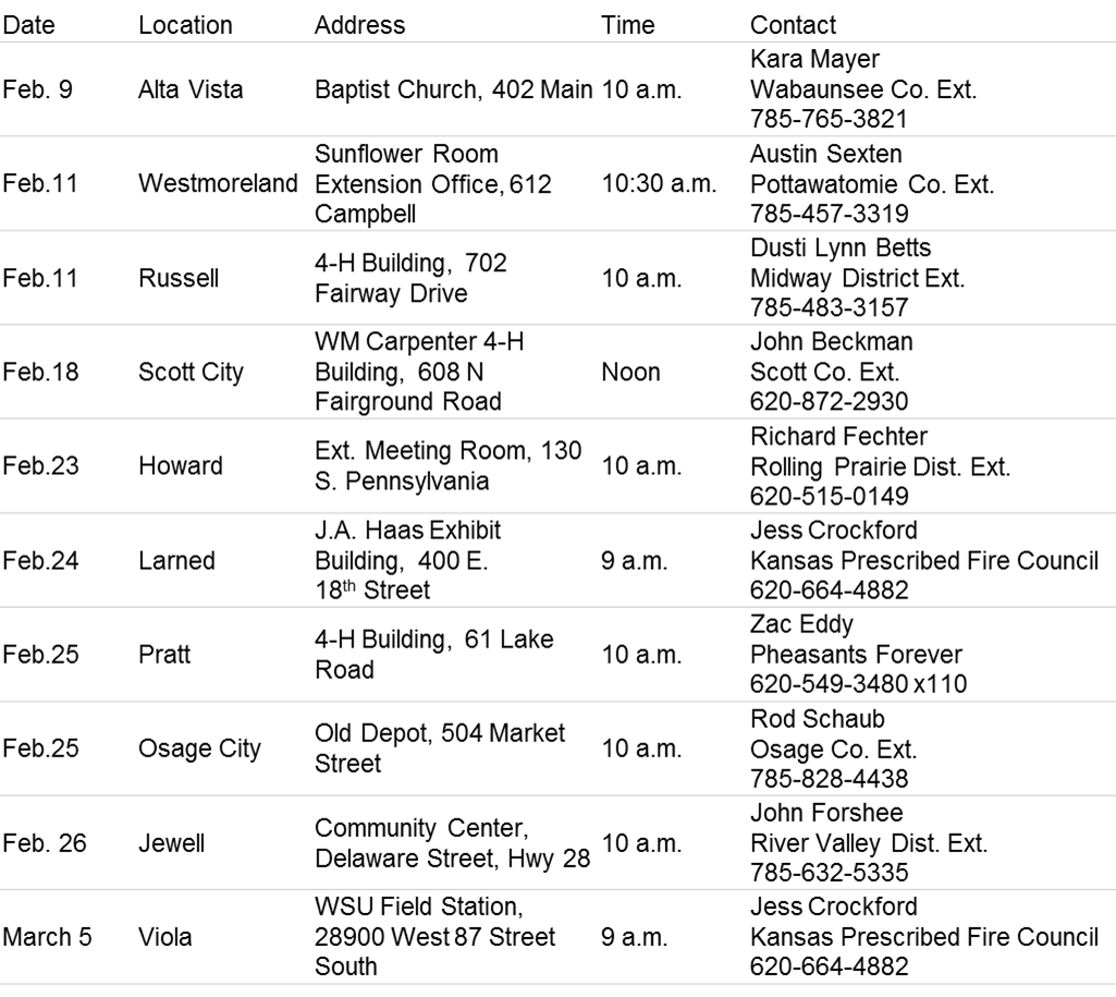 MANHATTAN – Ten Prescribed Fire Workshops are scheduled to be held throughout February and into March. Each meeting normally lasts about 5 hours. There may be a charge for materials and lunch. People will need to contact those listed in the chart below to ask about charges.