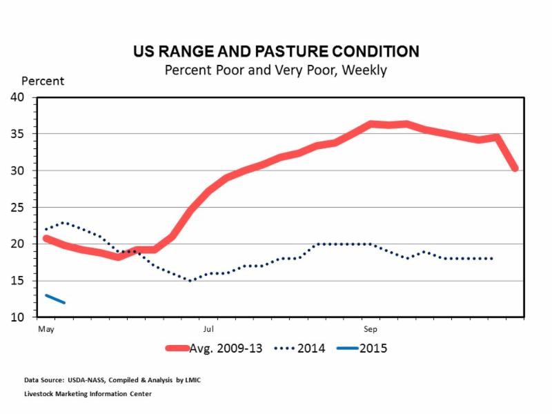 LIVESTOCK MARKETING INFORMATION CENTER – Nationwide spring/summer pasture and range conditions have started off very well. Of course, the most notable exception is California. USDA-NASS began reporting weekly conditions on May 4, 2015.