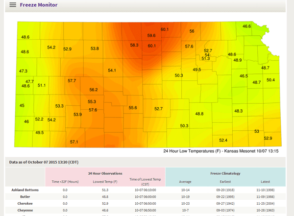 KSU eUPDATE – At this time of the year, freezing temperatures are of interest. Questions arise as to how cold did it get, and how long the temperatures were below freezing. To answer these questions, the Kansas mesonet on K-State’s Weather Data Library web site has launched a new product called Freeze Monitor.