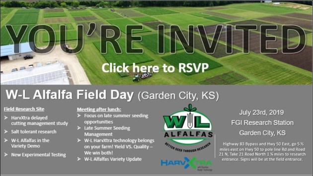 W-L ALFALFAS – The W-L Alfalfas Field Day in Garden City is set for Tuesday, July 23, with a 9:30 am registration at the FGI Research Center located East of Garden City, KS Below is a link to register and is helpful in us determining the number of meals to plan for.