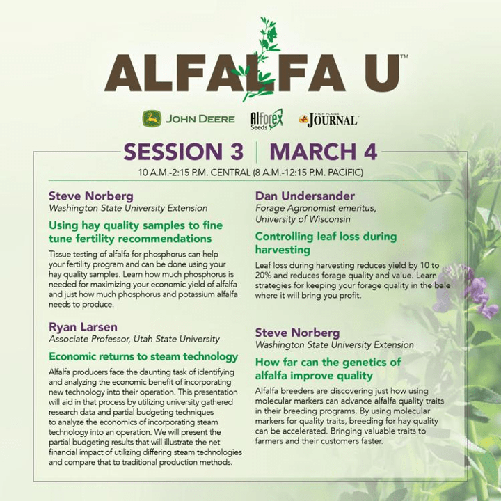 Alfalfa U Virtual events are free to attend, but registration is required to access the event links and recordings. Register at hpj.com/alfalfau.