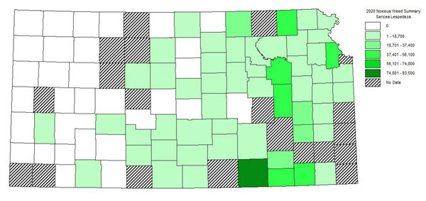 Extension Agronomy eUpdate – Sericea lespedeza is a major invasive species of concern on rangeland, pasture, and some CRP acres in Kansas. This state-wide noxious weed infests over 600,000 acres in Kansas (Figure 1).