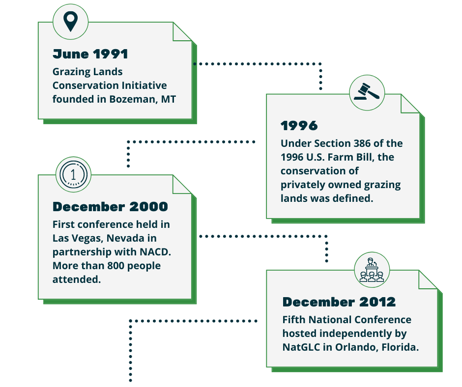 In June of 1991, a meeting was called by representatives of state and national agricultural, conservation, wildlife, and scientific organizations leading to the establishment of the Grazing Lands Conservation Initiative. Twenty-two states were represented at the meeting. During this first organizational meeting, six national organizations agreed to sponsor the GLCI. They were the Kansas Farm Bureau’s national affiliate, the American Farm Bureau Federation (AFBF), the Kansas Forage and Grassland Council’s national affiliate, American Forage and Grassland Council (AFGC), American Sheep Industry (ASI), National Association of Conservation Districts (NACD), the Kansas Livestock Association’s national affiliate, National Cattlemen’s Beef Association (NCBA), and the Society for Range Management (SRM). In December of 2000, the first national conference was held in Las Vegas, Nevada, beginning the triennial cycle of well attended conferences.