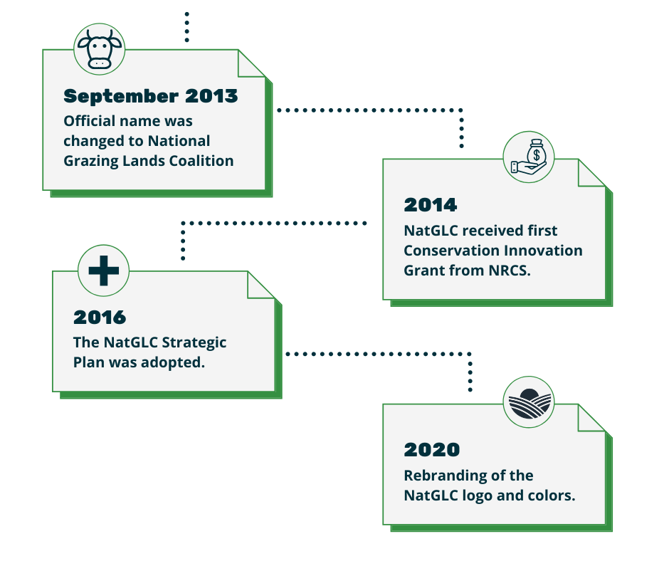 By 2012, the organization continued these conferences, but this time hosted independently. The following year, the organization underwent a name change to what it is now known as, the National Grazing Lands Coalition. Since then, NatGLC has continued to progress. The organization has been awarded two Conservation Innovation Grants from NRCS, as well as strengthened partnerships with other organizations. In 2016, NatGLC developed a strategic plan to ensure that their mission to promote ecologically and economically sound management of private grazing lands for their adapted uses and multiple benefits to the environment and society.