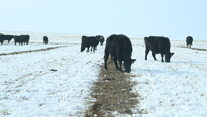 Garland Dahlke, an associate scientist at the Iowa Beef Center, notes that after an initial harvest for hay in July, the sorghum and millet are left to grow until it is cut again before the first consequential snowfall. Then, the forage is raked into swaths that are wide enough for cattle to find beneath a blanket of white.