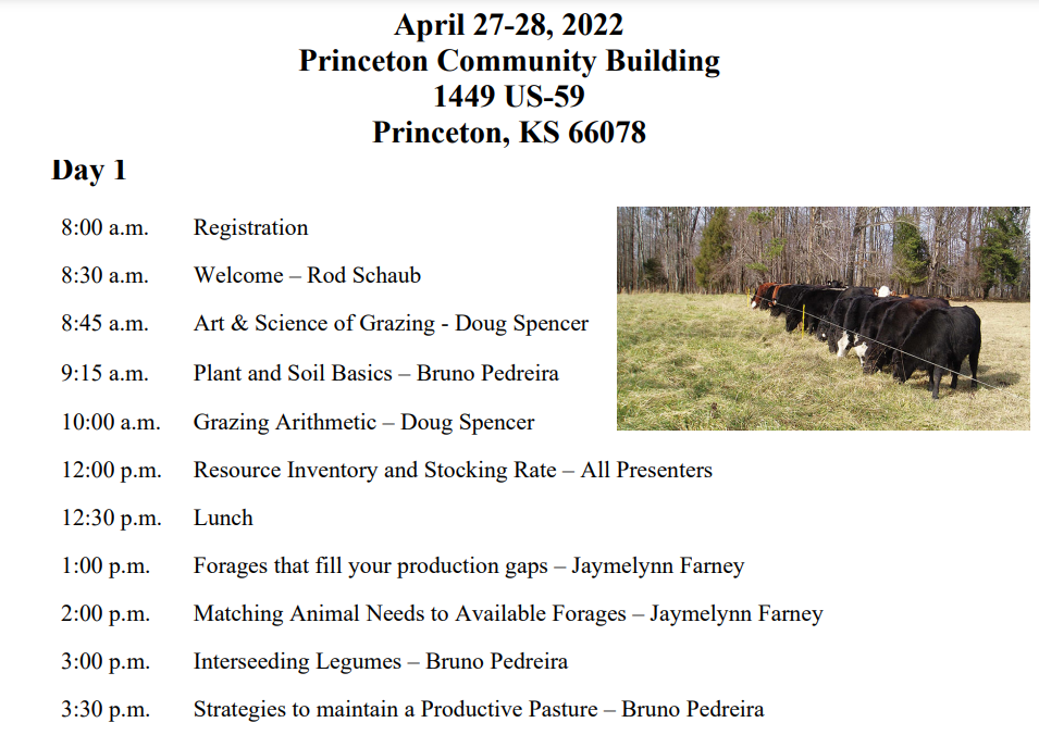 Rotation grazing is recognized as a way to utilize pastures and forages more efficiently. A collaboration of experts from K-State Research and Extension and the Natural Resource Conservation Service are joining together to offer a two-day event. 2022 marks the 9th Eastern Kansas Grazing School. This year’s school will be held April 27th and 28th at the Community Building in Princeton, at 1449 US Highway 59. The event will highlight information presented both in the classroom and in nearby pastures.