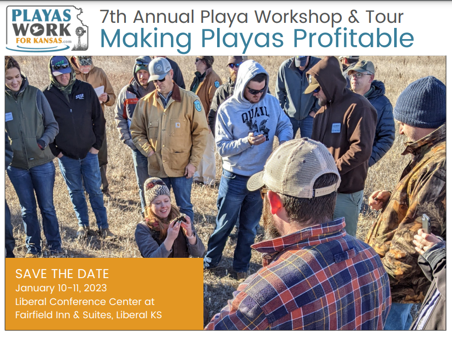 Want to know more about playas, the benefits they provide, and how to manage them as part of a profitable operation? Learn that and more at the 7th Annual Playa Workshop and Tour on January 10 and 11, 2023 at the Liberal Conference Center in the Fairfield Inn and Suites in Liberal, Kansas.