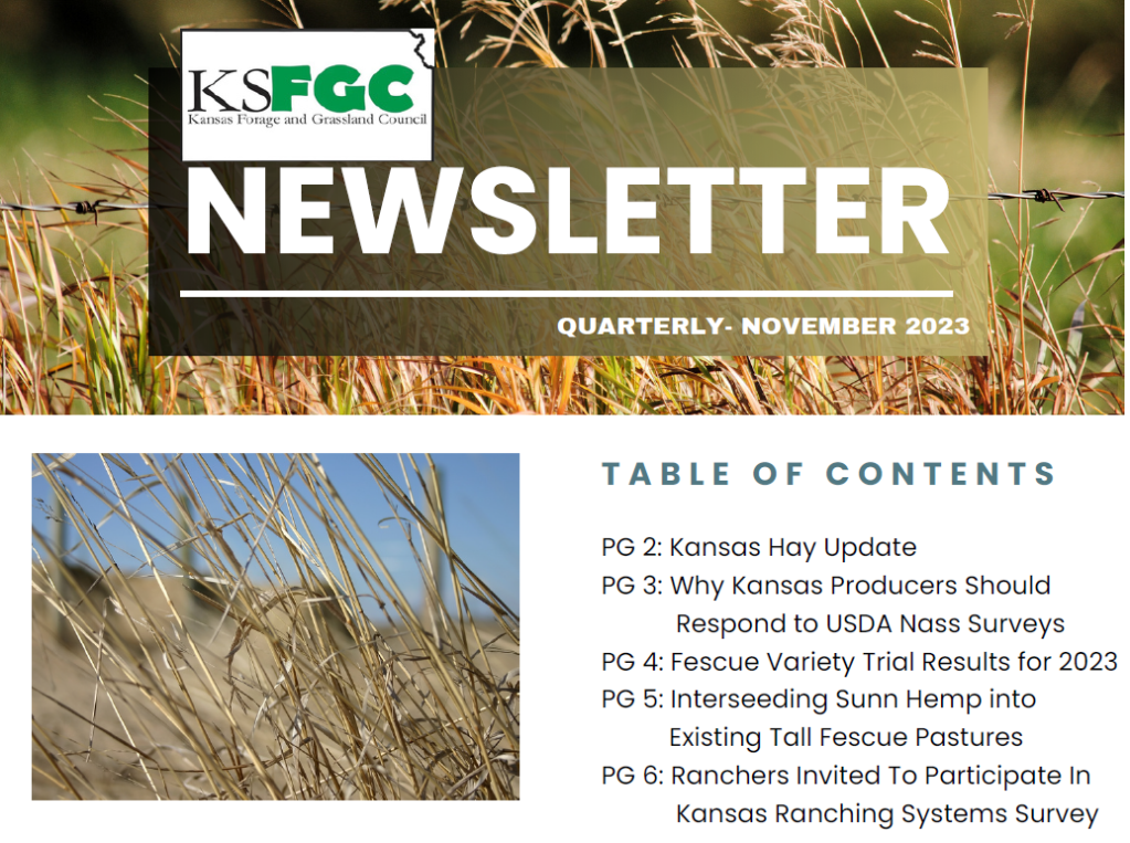 The fall edition of the KSFGC Newsletter was emailed to KSFGC members today. If you’d like a copy, join or renew your KSFGC membership, by going here, https://members.afgc.org/secure/membership.cfm and entering your name and email, then select, Affiliate Membership – Kansas Forage and Grassland Council.