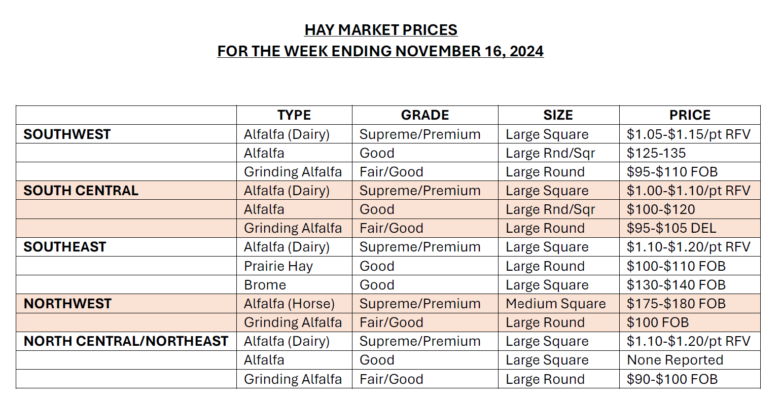 Demand light. Trade activity is slow. Dairy alfalfa, grinding alfalfa, and ground and delivered alfalfa price all steady. Alfalfa: Dairy, $1.05-$1.15/point RFV. Good quality, Stock or Dry Cow hay $125.00-$135.00. Fair/good, grinding alfalfa, large rounds $95.00-$110.00, large square $95.00-110.00. Ground and delivered locally to feed lots and dairies $145.00-$155.00. Grass Hay: Bluestem, none reported. CRP, large rounds $60.00-$70.00 delivered, Teff, large rounds $100.00-$110.00. The week of 11/10-11/16, 4,847T of grinding alfalfa and 825T of dairy alfalfa was reported bought or sold. The average paid by feedlots on November 1 for alfalfa ground and delivered was $163.44, down $6.86 from the previous month. Usage was 623T/day, down 6% from last month and total usage was 19,311T.