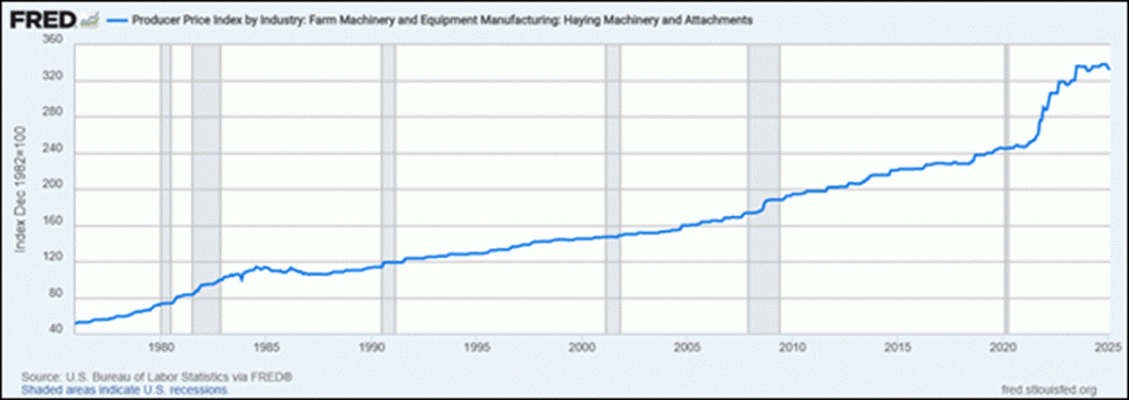The market determines what the value of the hay is. This issue is separate from what it costs to produce hay. It seems like no conversation about the cattle business can occur without comparisons to 2014. From December 2014 to January 2025, fertilizers, chemicals (including herbicides), and fuel have increased by 13%, 15%, and 9%, respectively1. During the same period, supply/repair costs and machinery costs have risen by 38% and 51%, respectively1. Admittedly, this comparison is not bulletproof. It compares two points in time and the categories are broad, but it suggests that the cost of owning and maintaining equipment warrants further analysis on the ranch. The graph illustrates the price trend of haying machinery and attachments. Careful consideration and planning will be needed when replacing these assets.