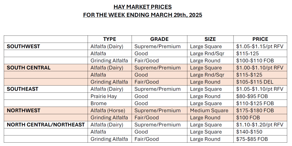 South Central Kansas Demand, light to moderate. Trade activity is slow to moderate. Dairy alfalfa, grinding alfalfa, ground and delivered, steady. Alfalfa pellet steady. Alfalfa: Dairy $1.00-$1.10/point RFV. Good, Stock cow, $115.00-$125.00. Fair/good grinding alfalfa, large rounds $105.00–$115.00 delivered, 3×4 and 4×4’s $100.00-$115.00 delivered. Alfalfa ground and delivered $140.00-$150.00. Alfalfa pellets: Sun cured 15 pct protein $220.00-$225.00, 17 pct protein $225.00-$230.00, 17% dehydrated $340. Grass hay: Bluestem, none reported. Brome, none reported. Sudan, large rounds, $50.00-$60.00. The week of 3/23-3/29, 6,599.50T of grinding alfalfa and 200T of dairy alfalfa was reported bought or sold.