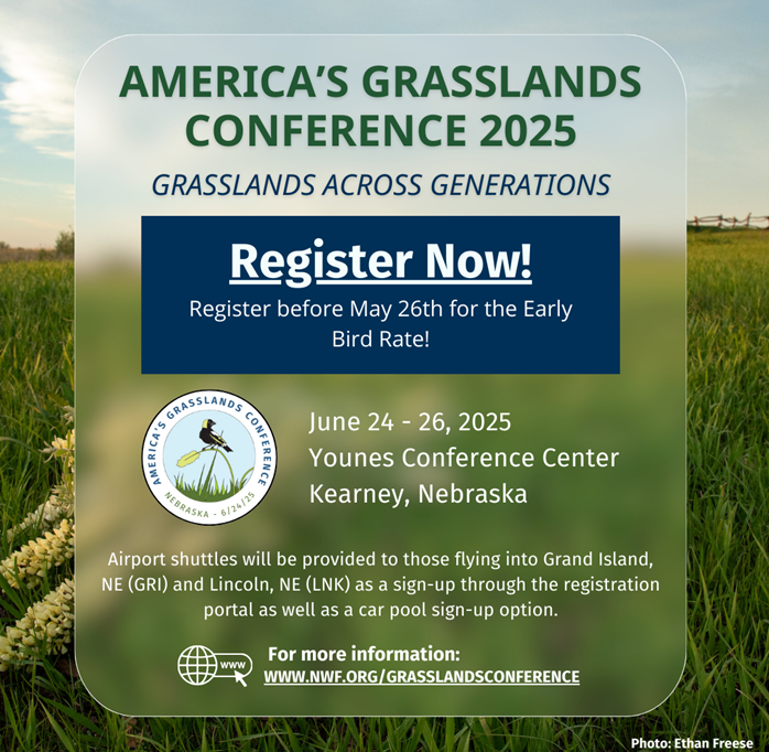 Register now at: https://www.nwf.org/grasslandsconference. Register by May 26th for the early bird registration rate of $325 after which the rate increases. Attendance scholarship applications for producers and students are available thanks to our generous conference sponsors!