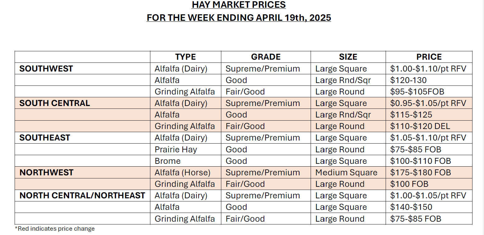 Southwest Kansas Demand, light. Trade activity is slow. Dairy alfalfa, grinding alfalfa, alfalfa and ground and delivered, steady. Alfalfa: Dairy, $1.00-$1.10/point RFV. Good quality, Stock or Dry Cow hay $120.00-$130.00. Fair/good, grinding alfalfa, large rounds $95.00-$105.00, large square $95.00-105.00. Ground and delivered locally to feed lots and dairies $150.00-$160.00. Grass Hay: Bluestem, large rounds CRP $75.00/bale. The week of 4/13-4/19, 6,286.5T of grinding alfalfa and 0T of dairy alfalfa was reported bought or sold.