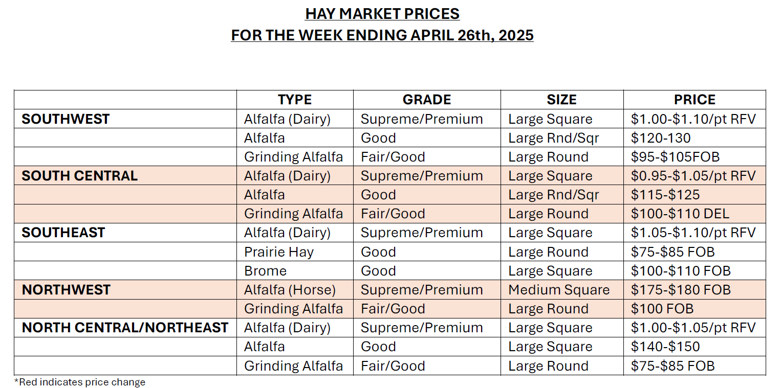 South Central Kansas Demand, light to moderate. Trade activity is slow to moderate. Dairy alfalfa, alfalfa pellets and ground and delivered, steady. Grinding alfalfa is $10.00 lower. Alfalfa: Dairy $0.95-$1.05/point RFV. Good, Stock cow, $115.00-$125.00. Fair/good grinding alfalfa, large rounds $100.00–$110.00 (-10) delivered, 3×4 and 4×4’s $100.00-$110.00 (-10) delivered. Alfalfa ground and delivered $135.00-$145.00. Alfalfa pellets: Sun cured 15 pct protein $215.00-$220.00, 17 pct protein $220.00-$225.00, 17% dehydrated $340. Grass hay: Bluestem and brome, none reported. Sudan, large rounds, $50.00-$60.00. The week of 4/20-4/26, 7,113.5T of grinding alfalfa and 159T of dairy alfalfa was reported bought or sold.