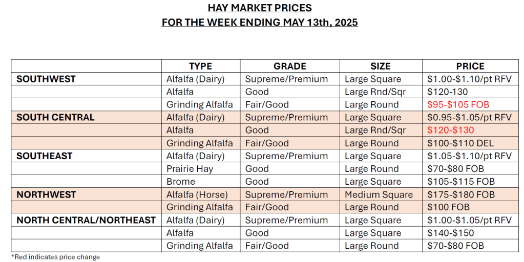 North Central-Northeast Kansas Demand light. Trade activity is slow. Dairy alfalfa steady. Grinding alfalfa steady. Alfalfa ground and delivered steady. Bluestem grass, mostly steady. Brome, steady. Alfalfa: Dairy $1.00-$1.05/point RFV; Stock Cow good, none reported; Fair/good, grinding alfalfa, large rounds $70.00-$80.00, 3×4 and 4×4 $105.00-$115 delivered. Alfalfa ground and delivered $140.00-$150.00.00. Grass hay: Bluestem, large rounds $65.00-$75.00. Brome: none reported. The week of 5/04-5/10, 846T of grinding alfalfa and 675T of dairy alfalfa was reported bought or sold.