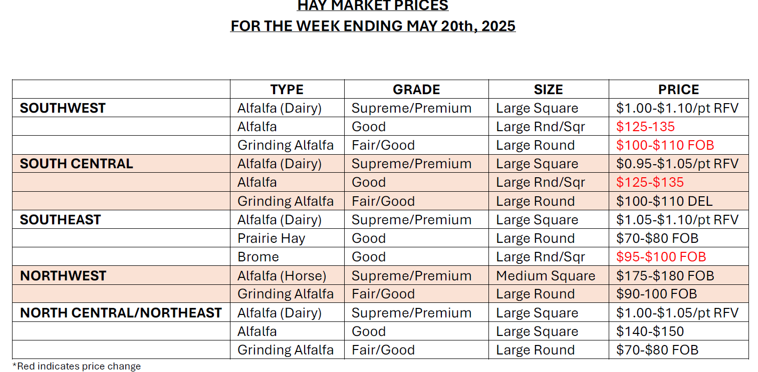 South Central Kansas Demand, light. Trade activity is slow. Dairy alfalfa, alfalfa pellets, steady. Grinding alfalfa steady. Ground and delivered steady. Alfalfa: horse or goat, small squares $10.00/bale delivered. Alfalfa: Dairy $0.95-$1.05/point RFV. Good, Stock cow, $120.00-$130.00. Fair/good grinding alfalfa, large rounds $100.00–$110.00 delivered, 3×4 and 4×4’s $100.00-$110.00 delivered. Alfalfa ground and delivered $140.00-$150.00. Alfalfa pellets: Sun cured 15 pct protein $215.00-$220.00, 17 pct protein $220.00-$225.00, 17% dehydrated $340. Grass hay: Bluestem, rounds and squares $75.00-$85.00. Brome, none reported. Sudan, large rounds, $50.00-$60.00. The week of 5/04-5/10, 5,729.5T of grinding alfalfa and 159T of dairy alfalfa was reported bought or sold.