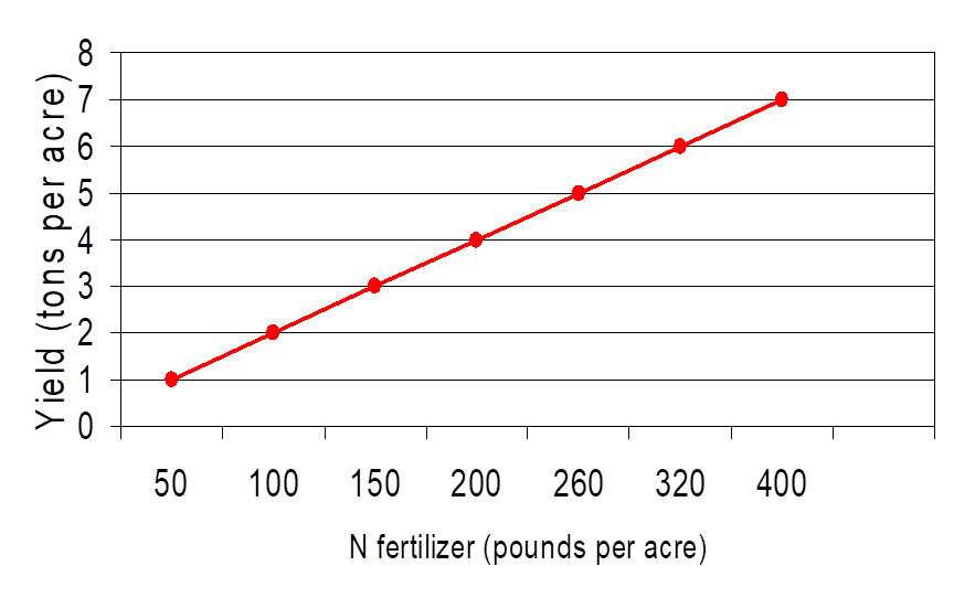 Bermudagrass, an introduced forage, is very important to Oklahoma cow-calf operations. Bermudagrass has some highly beneficial characteristics. Yield, persistence, nutritional value, timing of growth and production, tolerance to heavy grazing, responsiveness to fertilization and resistance to herbicides. A key benefit of Bermudagrass is the potential to support higher stocking rates than native range. When properly managed (for weed control and fertilization) and in response to adequate rain, Bermudagrass has the potential to be highly productive. On the downside, Bermudagrass requires these inputs on an annual basis in order to achieve maximum productivity. The chart below shows the linear response of bermudagrass production relative to Nitrogen applied.