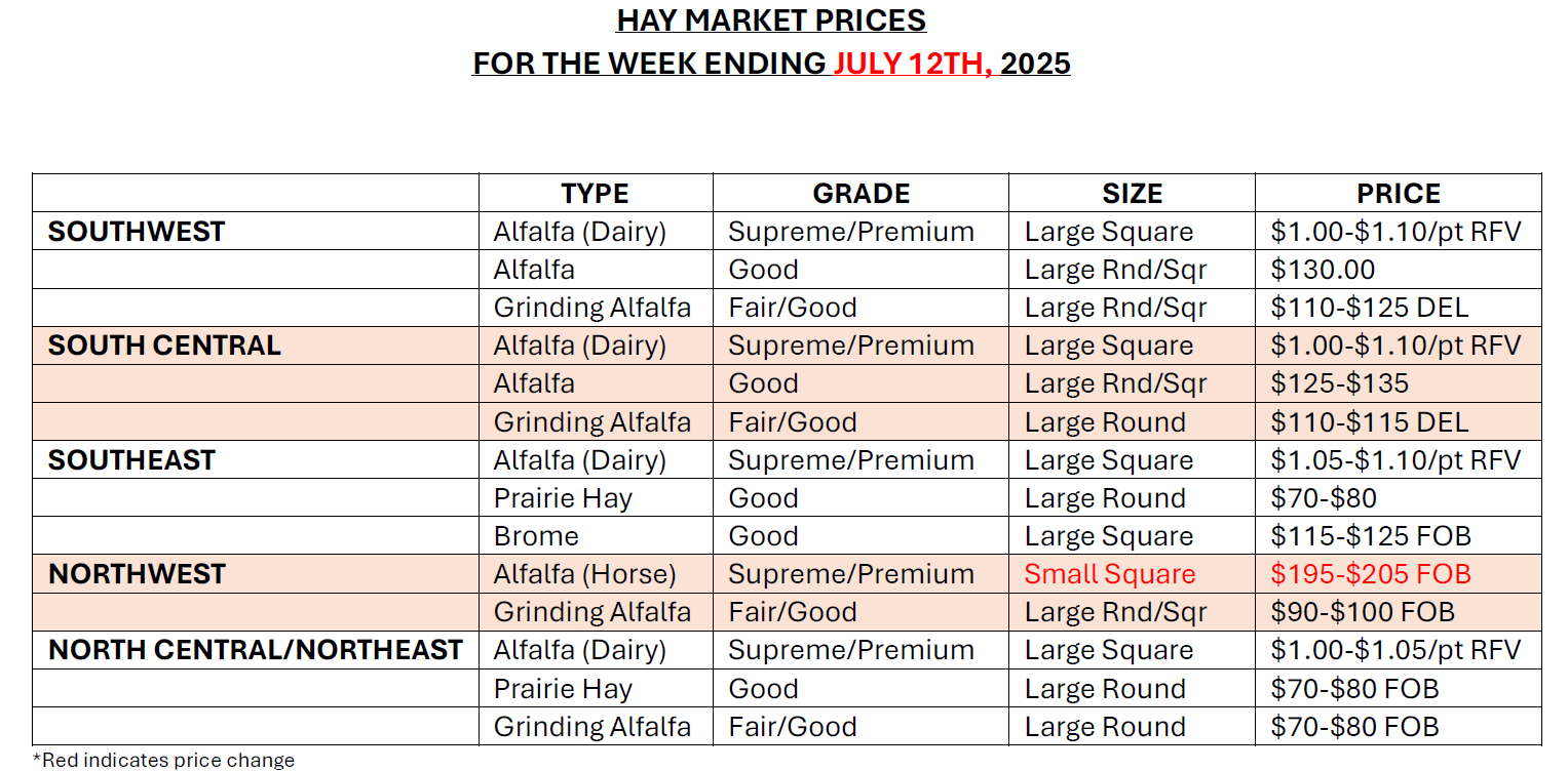 This past week, demand was light, trade was moderate, and prices were steady, on limited test as producers have been busy in the fields. Hot, muggy and humid weather seems to be the current trend, with the southwest continuing to receive rain. This is great for corn but hard on the hay producer. According to the U.S. Drought Monitor for the week of July 8th, another round of heavy rainfall (1 to 2 inches, locally more) supported a 1-category improvement to parts of the Northern and Central Great Plains. Eastern Kansas has missed out on the heavy rainfall recently and abnormal dryness (D0) was added to that part of the state. The categorical percent area of abnormally dry conditions (D0) increased to nearly 25%, Moderate drought (D1) remained at 6%, Severe drought (D2) remained near 1%, and no Extreme drought (D3) or Exceptional drought (D4) was recorded. Prices below reflect the average price. There could be prices higher and lower than those published. FULL AMS REPORT
