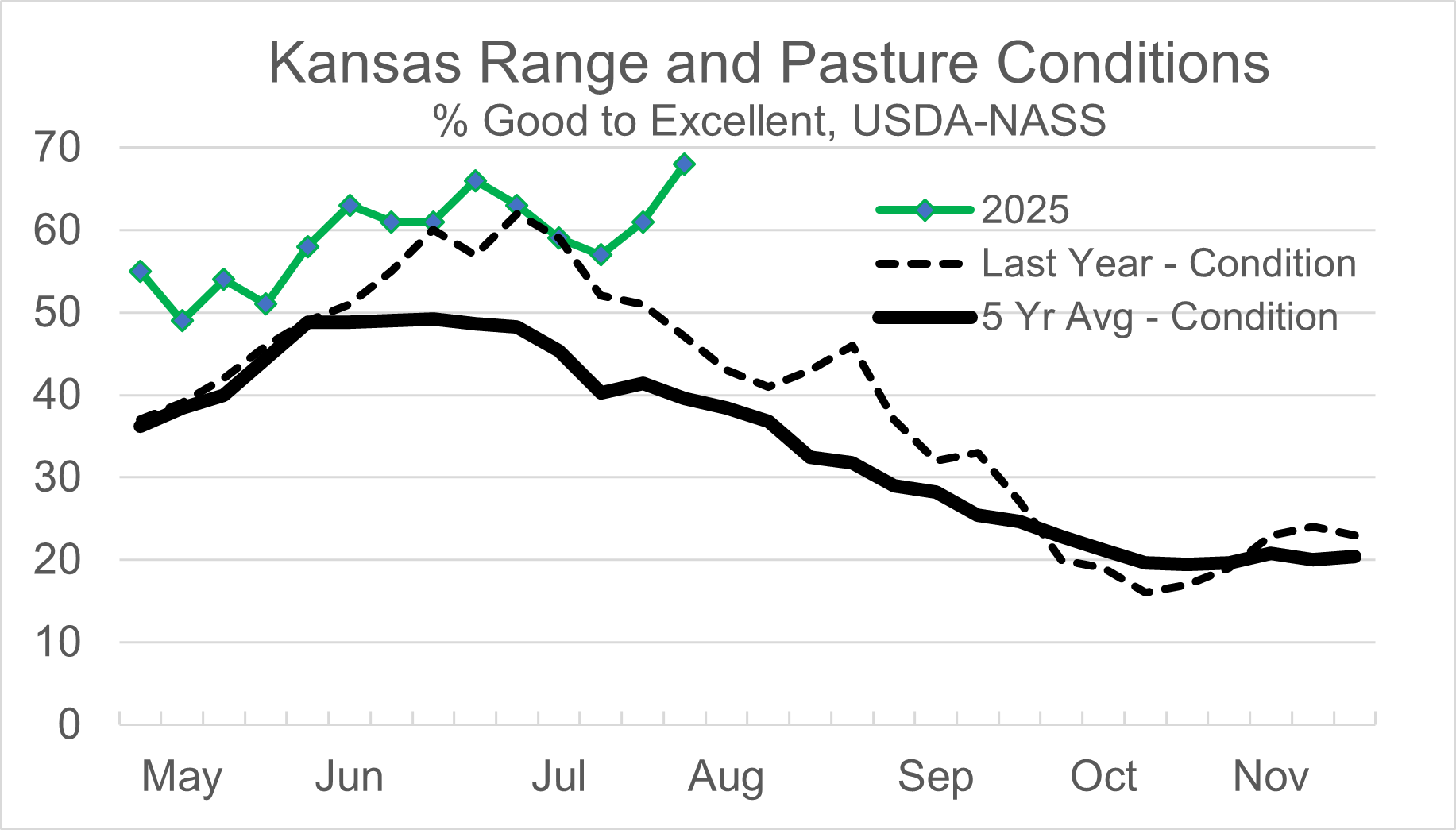 According to the National Agricultural Statistics Service (NASS), for the week ending August 3, 2025, Kansas pasture and range conditions rated 4% very poor, 8% poor, 20% fair, 55% good, and 13% excellent. The 68% in the combined good/excellent category is the best for week 31 since the 70% good/excellent reached in 2019 and then again in 2016 (2009 to 2025 data).