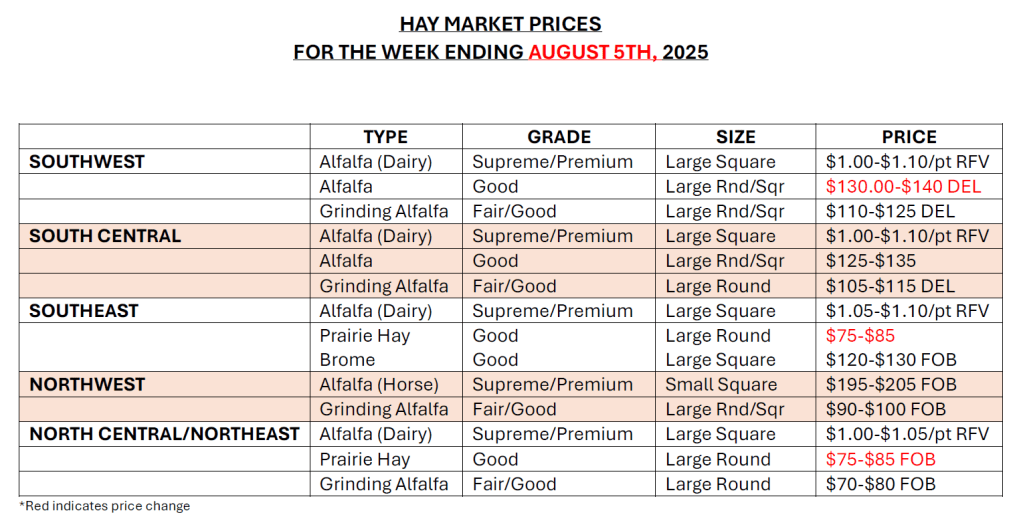 North Central-Northeast Kansas Demand light. Trade activity is slow. Dairy alfalfa, grinding alfalfa, alfalfa ground and delivered, bluestem, and brome, all steady. Alfalfa, horse hay, small square $10.00-12.00/bale, Alfalfa: Dairy $1.00-$1.05/point RFV; Stock Cow good, none reported; Fair/good, grinding alfalfa, large rounds $70.00-$80.00, 3×4 and 4×4 $105.00-$115 delivered. Alfalfa ground and delivered $135.00-$145.00.00. Grass hay: Bluestem, large rounds $75.00-$85.00, large square $90.00-$100.00. Brome: large rounds $70.00-$80.00, large squares 125.00-135.00. Wheat Straw, large round and large square $45.00-65.00. The week of 7/27-8/2, T of grinding alfalfa and T of dairy alfalfa was reported bought or sold.