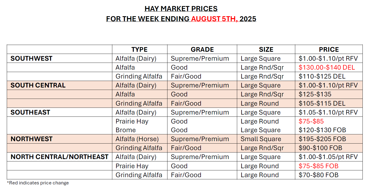 This past week, demand was light, and prices were steady. Trade was slow to moderate but saw an increase in the southwest region due to some larger alfalfa contracts. Overall, however, interest is just not picking up much and, currently, buyers have all types of forage and feed grains to pick from to include in their rations. Adding insult to injury, producers state that there is an abundance of rained hay. According to the U.S. Drought Monitor for the week of July 29th, improvements continued from Kansas to North Dakota after another week of scattered shower activity with light-to-moderate accumulations. During the past 30 days, drought-related conditions have improved significantly in northern Kansas, eastern Nebraska, southeastern and southwestern South Dakota, and southwestern North Dakota as evidenced in a variety of drought monitoring products including streamflows, soil moisture, and vegetation health indicators. The categorical percent area of abnormally dry conditions (D0) decreased to 9%, Moderate drought (D1) decreased to 4%, Severe drought (D2) decreased to 1%, and no Extreme drought (D3) or Exceptional drought (D4) was recorded. Prices below reflect the average price. There could be higher and lower prices than those published.