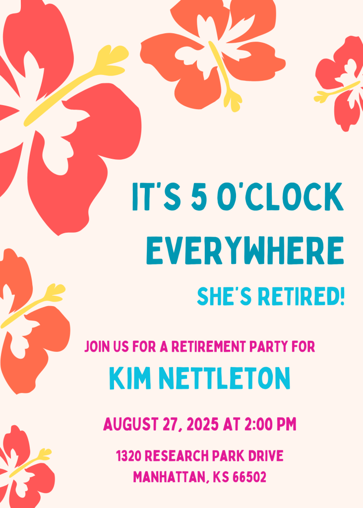 Join us for a retirement party for Kim Nettleton on August 27! If you can attend, please RSVP to KDA.events@ks.gov by Friday, August 22.