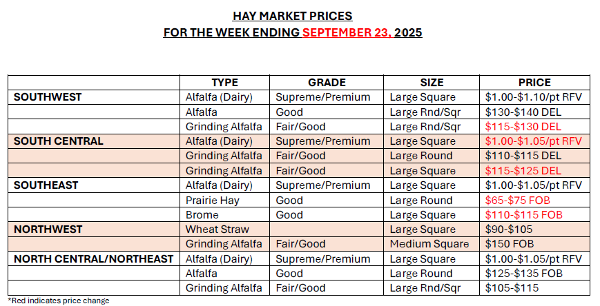 South Central Kansas Demand, light. Trade slow to moderate. Dairy alfalfa $0.05 lower per point, grinding alfalfa, ground and delivered $5 lower, alfalfa pellets, steady. Alfalfa: Dairy $1.00-$1.05/point RFV. Fair/good grinding alfalfa, large rounds $110.00–$115.00 delivered, 3×4 and 4×4’s $115.00-$125.00 delivered. Alfalfa ground and delivered $130.00-$140.00. Alfalfa pellets: Sun cured 15 pct protein $215.00, 17% dehydrated $340. Grass hay, brome, large round and large square $100.00-$120.00, small square $9/bale. The week of 9/14-9/21, 5,801T of grinding alfalfa and 250T of dairy alfalfa was reported bought or sold. The average paid by feedlots on September 1 for alfalfa ground and delivered was $138.24, down $3.69 from the previous month. Usage was 77T/day, down 18.9% from last month and total usage was 2,309.3T.