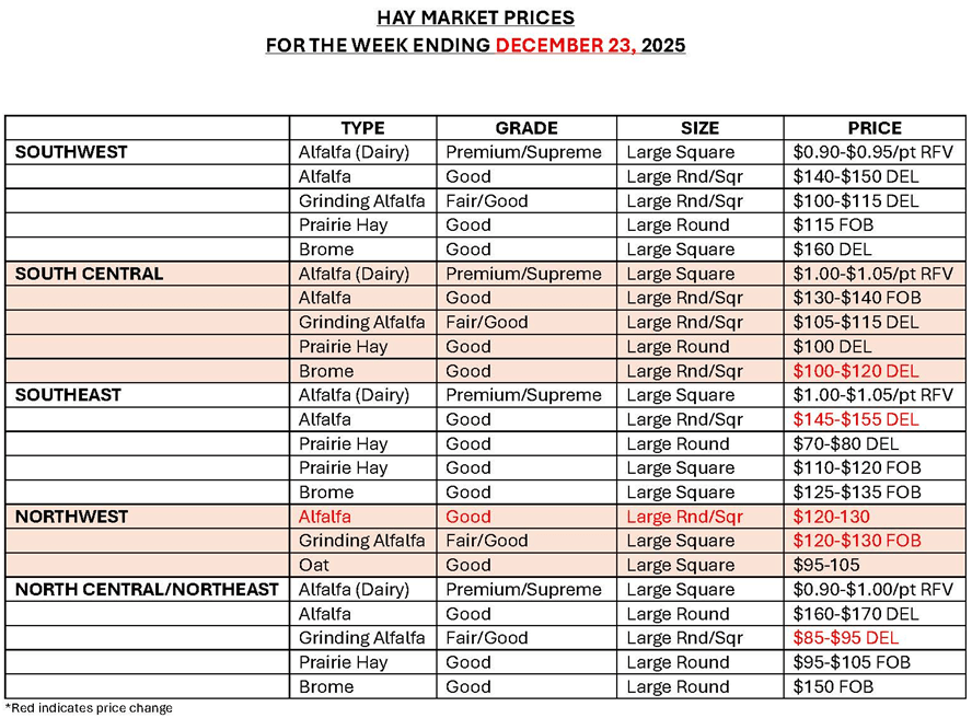 Hay movement remains steady and is expected to continue at a similar pace throughout the remainder of the year. Many producers are retaining hay inventories in anticipation of improved pricing next year rather than lowering prices to move supplies in the current market. Warmer than normal weather conditions have allowed livestock to remain on grass and wheat pasture, resulting in forage utilization below typical seasonal levels. According to the US Drought Monitor for the week of December 18th, The High Plains remained largely unchanged this week. Areas of less than one inch of precipitation fell across some areas of the Dakotas and northeastern Wyoming. In east-central South Dakota, this precipitation led to minor improvements with the removal of some abnormal dryness (D0). Nebraska, Colorado, and most of Kansas remained unchanged. In southeastern Kansas along the Kansas-Missouri border, hydrologic deficits led to further deterioration and the expansion of moderate drought (D1). In Kansas, the categorical percent area of abnormally dry conditions (D0) decreased to almost 20%, Moderate drought (D1) increased to 7.5%, and there was no severe (D2), extreme (D3) or exceptional drought (D4) recorded, with more than 72% of the state experiencing no drought. Prices below reflect the average price. There could be prices higher and lower prices than those published.