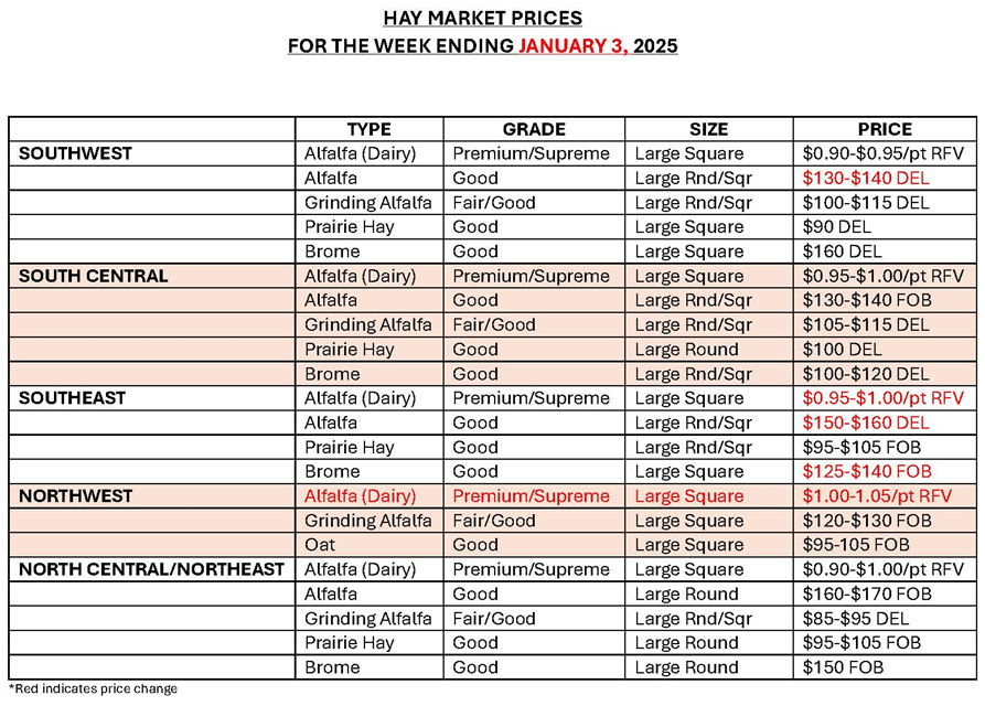 Southwest Kansas – Demand light to moderate. Trade slow to moderate. Dairy alfalfa, grinding alfalfa, ground and delivered, and grass hay, all steady. Stock cow $10 lower. Alfalfa: Dairy, $0.90-$0.95/point RFV. Good quality, stock or dry cow $130.00-$140.00 delivered. Fair/good, grinding alfalfa, large round and large square 3×4 $100.00-$115.00. Ground and delivered locally to feed lots and dairies $145.00-$155.00. Alfalfa pellets: Sun cured 15 and 17 pct protein $230.00. Alfalfa, small square $10.00/bale. Bluestem, large square 3×4 $90.00 delivered. Brome, large square 3×4 $160.00 delivered. Corn stalks, large round $80.00 delivered. The week of 12/28-1/3, 6,307T of grinding alfalfa, 525T of dairy alfalfa, and 184T of grass hay was reported bought or sold.