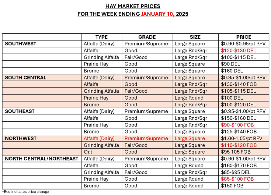 South Central Kansas – Demand light to moderate. Trade slow to moderate. Dairy alfalfa, grinding alfalfa, ground and delivered, and grass hay all steady. Stock cow $5 lower. Alfalfa: Dairy $0.95-$1.00/point RFV. Good quality, stock or dry cow $125.00-$135.00. Fair/good grinding alfalfa, large rounds and large square 3×4 $105.00–$115.00 delivered. Alfalfa ground and delivered $140.00-$150.00. Alfalfa pellets: Sun cured 15 pct protein $210.00–$215.00, 17% dehydrated $335. Bluestem, large round $100.00 delivered. Brome, large round and large square 3×4 $100.00–$120.00, small square $9.00/bale. Teff, large square 3×4 $140.00. Wheat, large round and large square 3×4 $75.00-$85.00. The week of 1/4-1/10, 10,039T of grinding alfalfa, 500T of dairy alfalfa, and 186 ton of grass hay was reported bought or sold. The average paid by feedlots on December 1 for alfalfa ground and delivered was $133.84, down $8.69 from the previous month. Usage was 196 tons per day.
