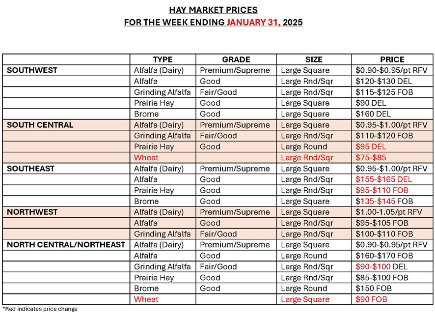 South Central Kansas – Demand light to moderate. Trade slow to moderate. Alfalfa and grass hay, all steady. 15% alfalfa pellets, $5.00 higher. Alfalfa: Dairy $0.95-$1.00/point RFV. Horse hay, small square $13.50-$15.50/bale. Good quality, stock or dry cow, none reported. Fair/good, grinding alfalfa large round $115.00-$125.00, large square 3×4 $105.00-$115.00. Alfalfa ground and delivered $140.00-$150.00. Alfalfa pellets: Sun cured 15 pct protein $215.00–$220.00, 17% dehydrated $335. Grass Hay: Bluestem, small square $8.00-$10.00/bale, medium square 3×3 $120.00, large round $95.00 delivered. Brome, none reported. Sorghum, large round $70.00. Wheat straw, large round and large square 3×4 $75.00-$85.00. The week of 1/25-1/31, 7,813T of grinding alfalfa, 550T of dairy alfalfa, and 465T of grass hay was reported bought or sold.