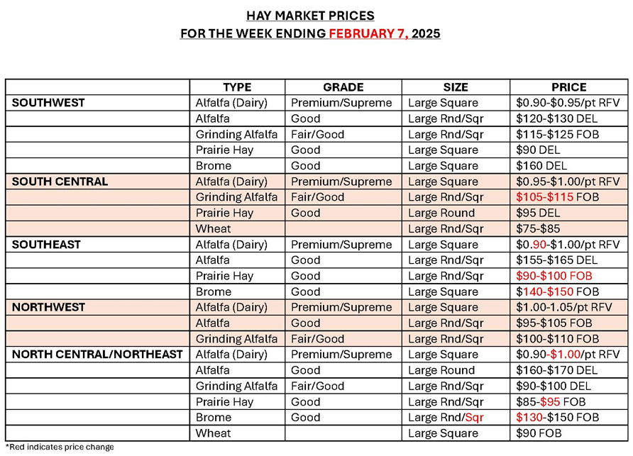 Last week, there was not much change recorded. Much of the state experienced warmer temperatures and increased sunshine last week, providing a welcome improvement in conditions. Interest in hay varied across regions, with some areas reporting increased inquiries, though no notable changes in pricing or movement were observed. According to the US Drought Monitor for the week of February 5th, conditions across the central and northern High Plains were mostly unchanged this week, as most of the region received little to no meaningful precipitation. Cold temperatures persisted, and where snow did fall, it remained largely frozen in place, limiting short-term benefits to soils or hydrologic conditions. Severe drought (D2) expanded from southeastern Wyoming into northeastern Colorado and a little into the Nebraska Panhandle. Abnormal dryness (D0) and moderate drought (D2) also expanded across portions of Kansas. In Kansas, the categorical percent area of abnormally dry conditions (D0) increased to 20%, Moderate drought (D1) increased to almost 5%, and there was no severe (D2), extreme (D3) or exceptional drought (D4) recorded, with 75% of the state experiencing no drought. Prices below reflect the average price. There could be prices higher and lower prices than those published.