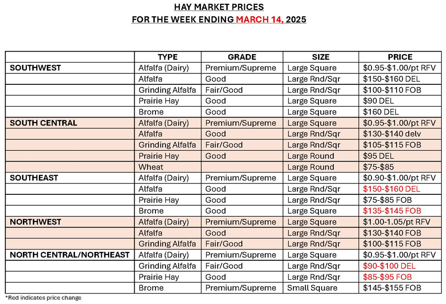 South Central Kansas – Demand light to moderate. Trade slow to moderate. Alfalfa and grass hay, all steady. Alfalfa: Dairy $0.95-$1.00/point RFV. Horse hay, small square $15.50-$17.50/bale. Fair/good, grinding alfalfa large round and large square 3×4 $105.00-$115.00. Alfalfa ground and delivered $140.00-$150.00. Alfalfa pellets: Sun cured 15 pct protein $215.00–$220.00, 17% dehydrated $335. Grass Hay: Bluestem, large round $95.00 delivered. Brome, none reported. Wheat straw, large square $75.00-$85.00. The week of 3/8-3/14, 8,165T of grinding alfalfa, 375T of dairy alfalfa, and 115T of grass hay was reported bought or sold.