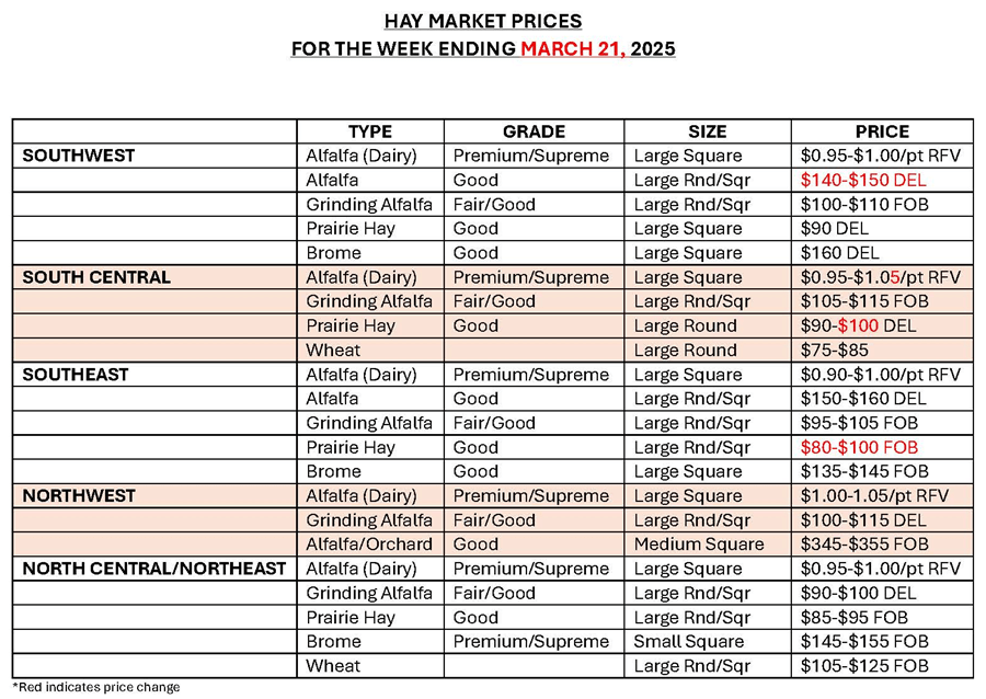 Southeast Kansas – Demand light to moderate. Trade slow to moderate. Dairy alfalfa, steady. Small square prairie hay $5 higher. Alfalfa: Dairy, $0.90-$1.00/point RFV. Good, stock or dry cow, $150.00-$160.00. Fair/good grinding alfalfa, large round and large square 3×4 $95.00–$105.00. Grass Hay: Bluestem, large round $75.00-$85.00, large square 3×4 $85.00-$105.00, medium square 3×3 $105.00-$115.00, small squares $165.00-$175.00. Brome, large square 3×4 $135.00-$145.00, medium square 3×3 $175.00-$185.00, small square $190.00-$200.00. Wheat straw, large round $70.00. The week of 3/15-3/21, 1,465T of grass hay, 100T of grinding alfalfa, and 121T of dairy alfalfa was reported bought or sold.