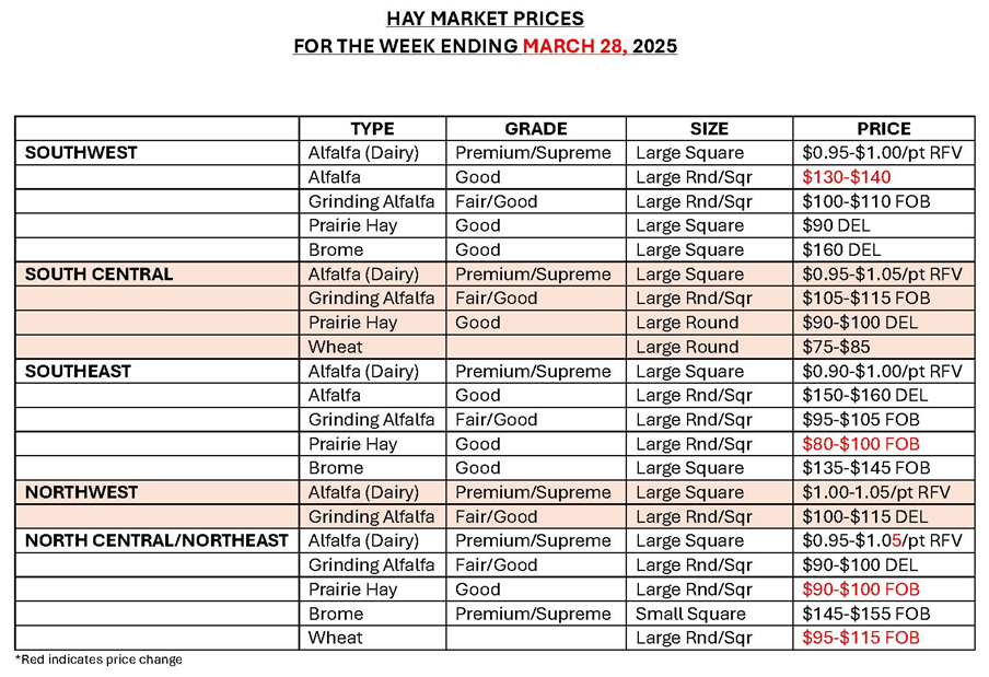 North Central-Northeast Kansas – Demand light to moderate. Trade activity slow to moderate. Alfalfa steady. Prairie hay $5 higher. Alfalfa: Dairy $0.95-$1.05/point RFV; Horse hay, small square $13.00/bale, medium square 3×3 $220.00-$230.00. Fair/good, grinding alfalfa, large round $90.00-$100.00 delivered. Alfalfa ground and delivered $130.00-$140.00. Grass Hay: Bluestem, large round and large square 3×4 $90.00-$100.00, small square $9.00/bale. Brome, small square, $145.00-$155.00. Wheat straw, large round and large square $95.00-$115.00. The week of 3/22-3/28, 302T of grinding alfalfa, 400T of dairy alfalfa, and 782T of grass hay was reported bought or sold.