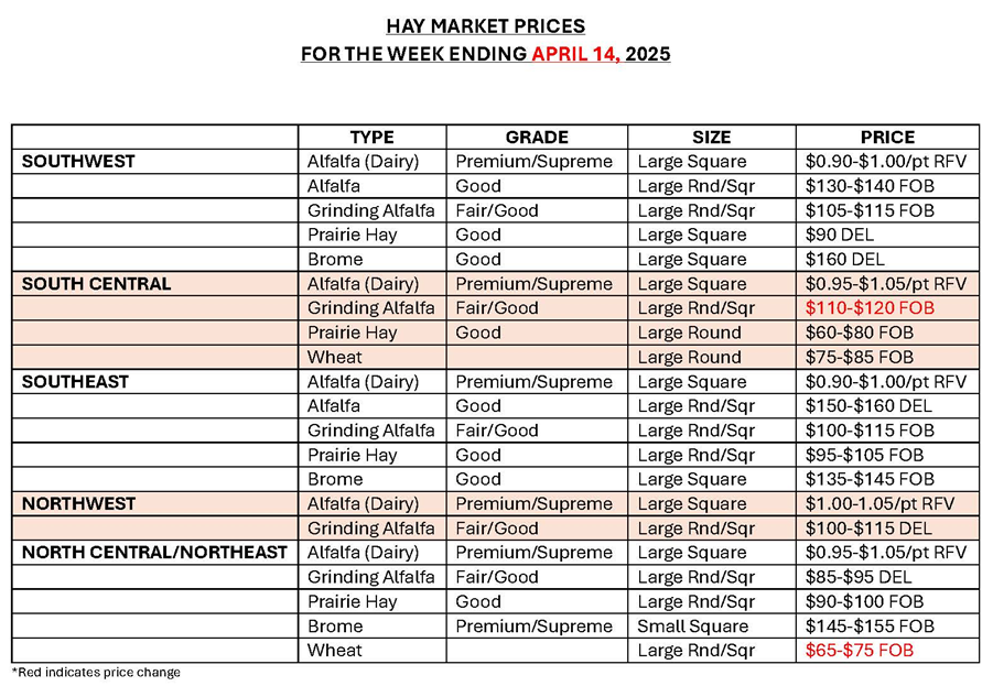South Central Kansas – Demand light to moderate. Trade slow to moderate. Dairy alfalfa and all grass hay steady, grinding hay $5 lower. Alfalfa: Dairy $0.95-$1.05/point RFV. Horse hay, small square $16.00-$18.00/bale. Fair/good, grinding alfalfa large round $115.00-$125.00, large square 3×4 $105.00-$115.00. Alfalfa ground and delivered $135.00-$145.00. Alfalfa pellets: Sun cured 15 pct protein $215.00–$220.00, 17% dehydrated $335. Grass Hay: Bluestem, large round $60.00-$80.00, small square $17.00-$18.00/bale. Brome, large round $70.00-$80.00. Wheat straw, large square $75.00-$85.00. The week of 4/5-4/11, 7,421T of grinding alfalfa, 325T of dairy alfalfa, and 552T of grass hay was reported bought or sold. The average paid by feedlots on March 1 for alfalfa ground and delivered was $145.58, up $14.73 from the previous month. Usage was 164 tons per day and total usage was 1,994T.